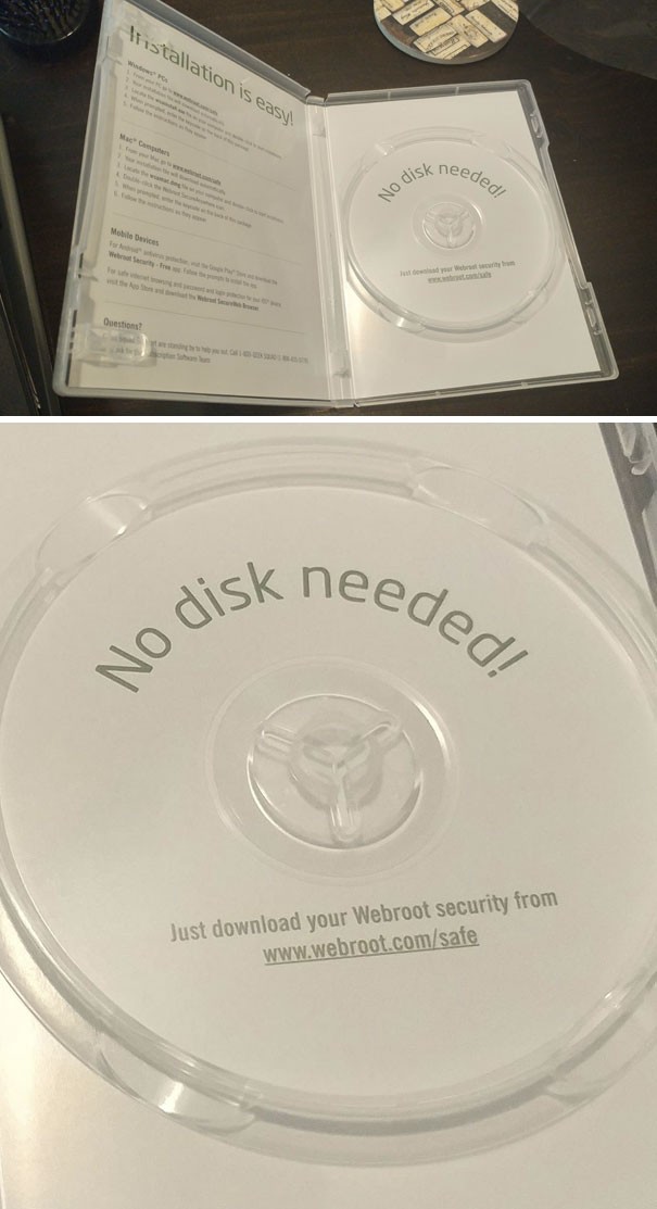 In der Verpackung eines Computers mit integriertem Anti-Virus wurde eine ganze CD-Hülle triumphierend beschrieben: "Keine CD wird benötigt!" Habt ihr jemals so einen absurden Plastikmüll gesehen?
